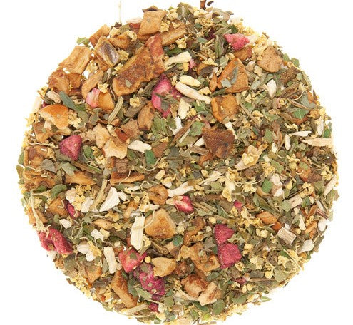 Apple pieces, Strawberry leaves, Ashwagandha root, Elderflower petals, Cranberry pieces, Cornflower petals, Natural flavors (Organic compliant)