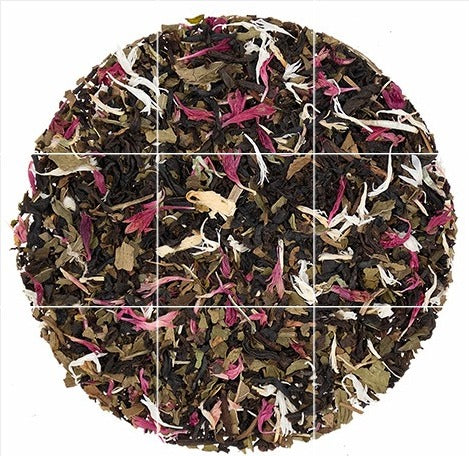 Black tea, Peppermint, Cornflower petals, Stevia, Natural flavors (organic compliant).
